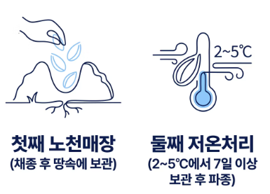 - 장점: 겨울 동안 땅속에서 자연스럽게 추위를 견디며 휴면이 타파됩니다. 이듬해 봄, 기온이 오르면 일제히 발아하여 생존율이 매우 높습니다.